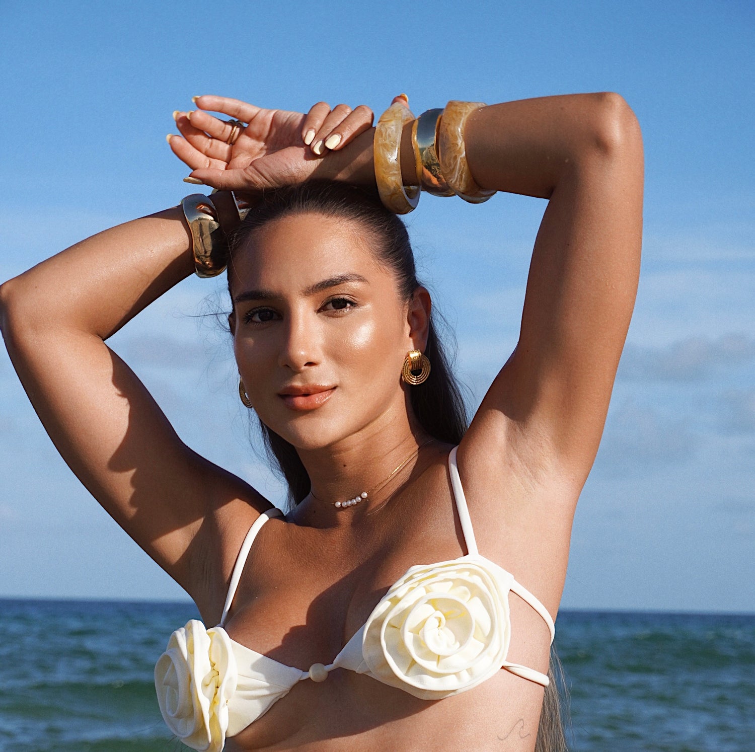 At D'azur, We craft stunning pieces featuring a luxurious layer of 18k gold plating over durable stainless steel. Our innovative anti-tarnish finish ensures your jewelry retains its brilliant glow, while the hypoallergenic stainless steel base provides exceptional comfort for even the most sensitive skin. This material is waterproof & tarnish proof, but must be taken care of.